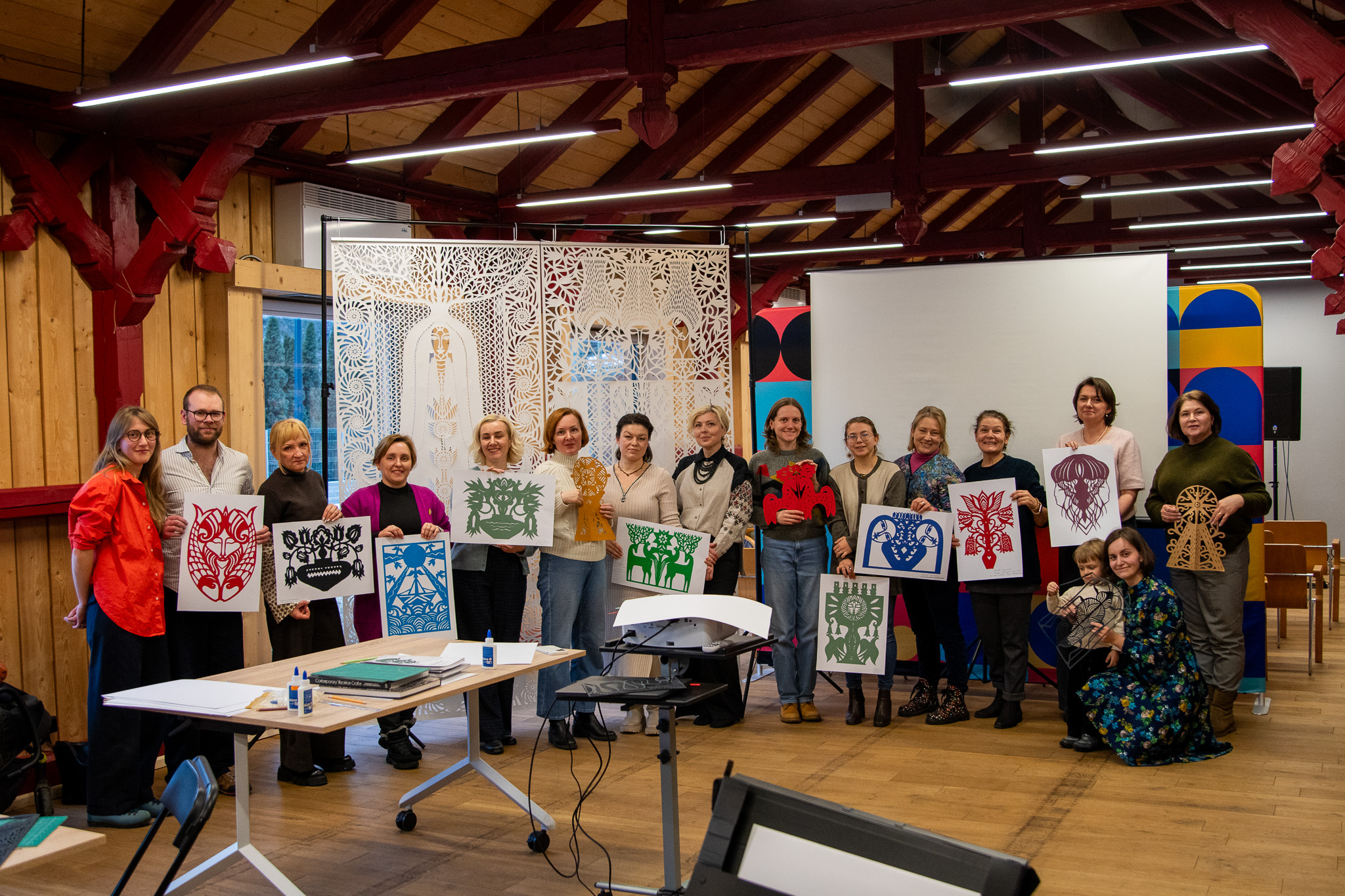 Efektem warsztatów były gotowe, autorskie prace — każdy uczestnik i każda uczestniczka wyszli z własnoręcznie wykonaną wycinanką przygotowaną na bazie szablonu Darii Alyoshkiny. Powstały realizacje różnorodne, mimo wspólnego punktu wyjścia: inne rytmy cięć, inne akcenty, inne tempo pracy. To właśnie ta różnorodność pokazała, jak twórczy potencjał uruchamia spotkanie z dobrym rzemiosłem i mądrym prowadzeniem.