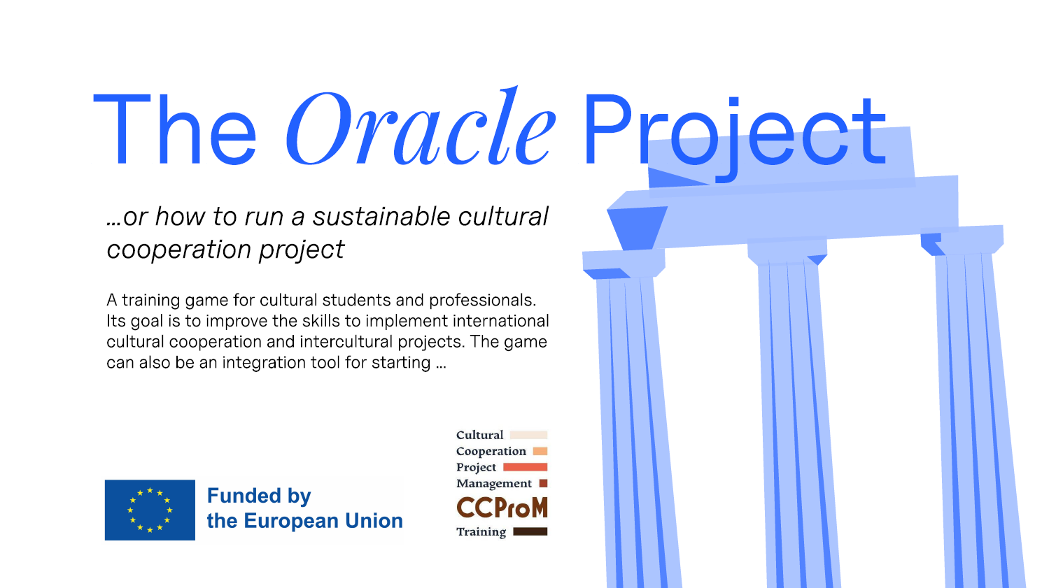Rezultatem działań strategicznych projektu CCPROM jest gra edukacyjna „The Oracle”. Wcielasz się w wizjonera kultury, który wraz z międzynarodowym konsorcjum przygotowuje nowatorski festiwal sztuki i współpracy. Twoim zadaniem jest łączenie różnych środowisk, zarządzanie ograniczonymi zasobami i pokonywanie wyzwań, takich jak biurokracja czy różnice interesów.